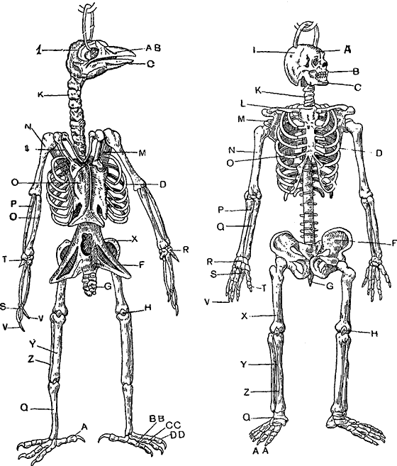 Скелет птицы и скелет человека с отмеченными одинаковыми частями (Белон, 1664).