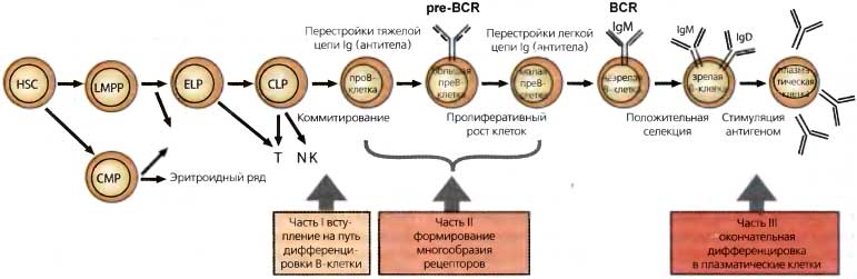 Гематопоэтические стволовые клетки (HSC) дифференцируются через обозначенные стадии развития в секретирующие иммуноглобулин плазматические клетки: LMPP — лимфоид-праймированные мультипотентные прогениторы; СМР — общий миелоидный прогенитор; ELP — самые ранние прогениторы лимфоцитов: CLP — общий лимфоидный прогенитор. Части 1-111, указанные внизу рисунка, обозначают стадии лимфопоэтического развития, эпигенетические механизмы которых были исследованы и которые обсуждаются в этой главе