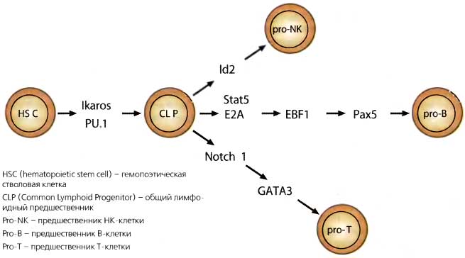 Прогениторы естественных киллеров (NK), линий В- и Т-клеток развиваются из гемопоэтических стволовых клеток (HSC) под контролем обозначенных факторов транскрипции. Детальное описание см. Bussinger (2004)