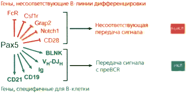Рах5 активирует гены, специфичные для В-клеток, участвующие в (пре)ВСВ-сигналинге и подавляет неприемлемые для линии гены, необходимые для трансдукции сигнала в миелоидных (FcRy, Csfr) или Т-лимфоидных (Notchl, CD28, Grap2)
