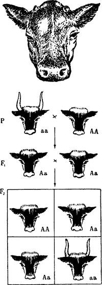 При этом исходили из того, что гаметы с рецессивом в равной мере могут встретиться и среди самцов и среди самок. Но 400 телят получены от 400 коров, быков же для этого применили не более четырех. Значит, один из них гетерозиготный, то есть дает половину гамет типа а. Отсюда следует, что среди коров гетерозиготных много меньше, чем высчитано по формуле.