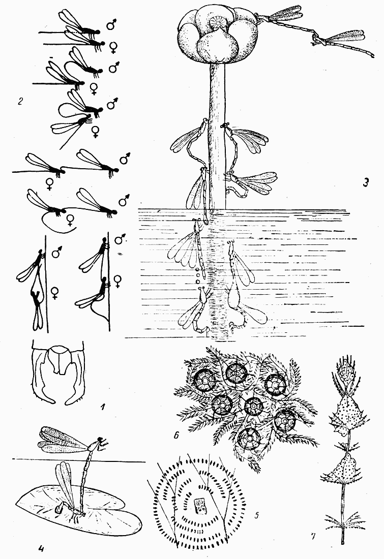 Таблица XI: Рис. 1. Хватательные щипцы самца лютки (Lestes viridis). - Рис. 2. Фазы копуляции стрелок. - Рис. 3. Стрелка (Erythromma najas) за откладкой яиц. - Рис. 4. Откладка яиц стрелкой (Соеnаgriоn pulchellum). - Рис. 5. Яйцевые кладки стрелки (Соеnаgriоn pulchellum). - Рис. 6. Яйцевая кладка симпетрум (Sympetrum) среди мха. - Рис. 7. Яйцевая кладка кордулии (Cordulia aenea) на харе.
