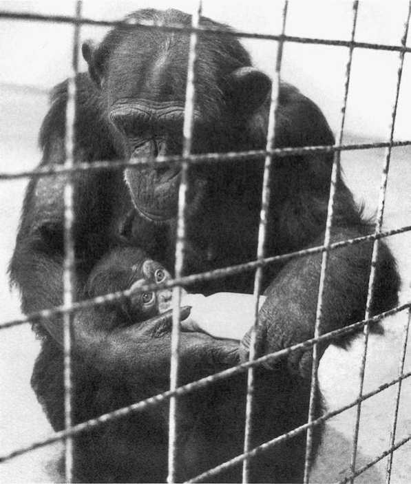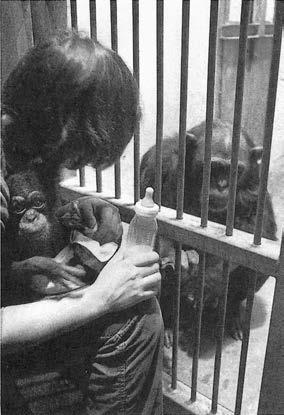 Эту печальную ситуацию удалось изменить в 1979 г. в результате уникального эксперимента, который получил широкую известность. Если кратко, мы научили Гориллу кормить детеныша шимпанзе из бутылочки. Детеныш, Розье, не был ее собственным. После того как за Розье десять недель ухаживали люди, Горилла приняла ее. С этого момента Розье не отходила от своей приемной матери и полностью от нее зависела. Горилла постоянно ухаживала за ней и не только кормила ее из бутылочки, но через неделю начала и сама давать молоко. Скорее всего, ее соски были стимулированы Розье, которая сосала их. После этого Розье стала получать более половины своего дневного рациона от Гориллы, а остальную часть – из бутылки.
