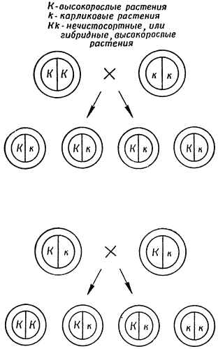Вверху — скрещивание чистосортного высокорослого растения с карликовым, которое дает гибридные, или нечистосортные, высокорослые растения. Внизу — скрещивание между собой гибридных растений первого поколения, которое дает чистосортные высокорослые растения, гибридные высокорослые растения и карликовые растения в отношении 1:2:1. Фактор карликовости обозначается буквой к, так как он рецессивен, а соответственный ему доминантный фактор высокорослости — К.