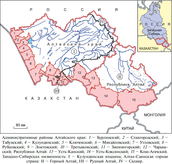 Значительная часть приграничных территорий Западной Сибири расположена в пределах Алтайского региона, объединяющего Алтайский край и Республику Алтай. На их долю приходится достаточно большой отрезок государственной границы России (1662 км) с тремя азиатскими государствами – Республикой Казахстан (на западе), Китаем и Монголией (на юге), что составляет, соответственно, 1362, 250 км и 50 км. Приграничные территории объединяют 15 административных районов Алтайского края и Республики Алтай (рис. 5.3). Удаленность от основных российских потребителей продукции и близость азиатских соседей позволяют рассматривать эти районы как весьма перспективные для развития интеграционных связей со странами Центрально-Азиатского региона, в том числе и при освоении природно-ресурсного потенциала.