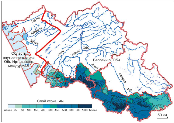 Эти воды принадлежат бассейну р. Оби – крупнейшей реки Западной Сибири, занимающему 56 401 км2 (или 74 % приграничной территории), и области внутреннего стока Обь-Иртышского междуречья, охватывающей 19 592 км2 (26 %). Суммарный поверхностный сток приграничных территорий составляет приблизительно 19,3 км3, при этом большая часть приходится на бассейн Оби, где формируется 98 % стока. На долю бессточного Обь-Иртышского междуречья приходится только 0,3 км3, или 2 % стока (рис. 5.4).