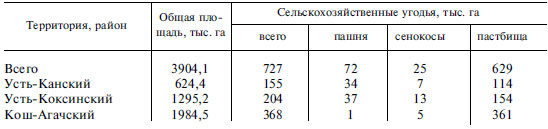 В структуре земельного фонда наибольшая часть приходится на земли сельхозназначения, общая площадь которых для приграничных районов составляет 1576 тыс. га, или 40,4 % от земельного фонда (для сравнения 2632,5 тыс. га, или 28,3 %, – в республике) [Доклад., 2004]. Доля сельскохозяйственных угодий в структуре земель сельхозназначения также является достаточно высокой и составляет, соответственно, 13,4, 18,8 и 32,4 % для в Усть-Канского, Усть-Коксинского и Кош-Агачского районов. На территории приграничья сосредоточено 68 % сельскохозяйственных угодий Республики Алтай. Площадь пашни и сенокосов составляет 97 тыс. га, или 13,3 %, от площади сельскохозяйственных угодий. Распределение пашен резко дифференцировано в зависимости от природных условий от 18,1 и 22 %, соответственно, в Усть-Коксинском и Усть– Канский районах до 0,4 % – в высокогорном Кош-Агачском районе. В площади пашни большую часть занимают посевы многолетних (более 10 лет) трав, продуктивность которых практически не отличается от продуктивности естественных сенокосов. Усть-Коксинский район является единственным в Республике Алтай, где выращивают пшеницу [Доклад., 2004; План., 2007].