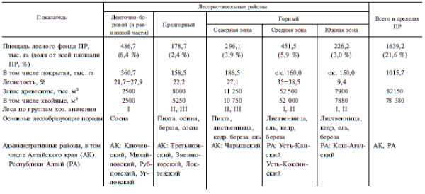 Общая площадь лесного фонда составляет 1639,2 тыс. га, 21,6 %, земель приграничных районов, из них на долю Алтайского края приходится 961,5 тыс. га и 28 % от лесного фонда Алтайского края [Материалы…, 2007]. Лесные ресурсы Республики Алтай сосредоточены на площади около 677,7 тыс. га и составляют 16 % ее лесного фонда. Общие ресурсы оцениваются более 82 млн м3, в том числе хвойных пород – 78 млн м3, из них значительная часть приходится на особо ценные сосновые боры и кедровые леса [Доклад…, 2004].