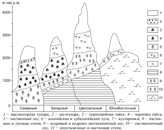 Приграничье располагается в пределах четырех физико-географических провинций Алтайской горной области физико-географической страны: Северо-Западной, Северной (частично), Центральной и Юго-Восточной. Каждая провинция имеет своеобразную высотную природную поясность, свой набор ландшафтов и свой видовой состав флоры и фауны. Схема высотной поясности Алтая приведена на рис. 5.5.