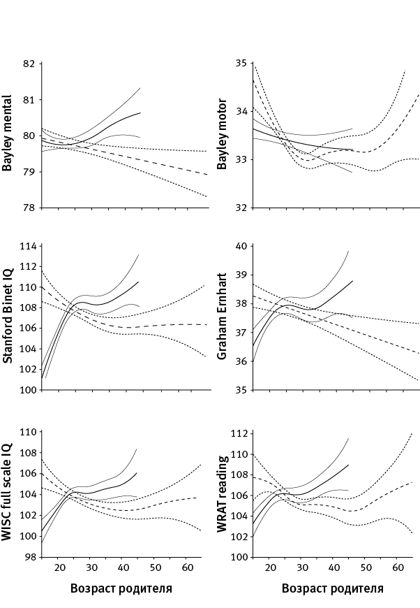 рис. 37.1. Зависимость различных нейрокогнитивных показателей у детей (в возрасте от 8 месяцев до 7 лет) от возраста отца (пунктирные линии) и матери (сплошные линии). По вертикальной оси — нейрокогнитивные показатели, по горизонтальной — возраст родителя в момент рождения ребенка. Графики основаны на данных по 33 437 американским семьям. Внесены поправки на возраст и пол ребенка, возраст второго родителя, расовую принадлежность, социоэкономический статус и другие параметры, которые могли бы исказить искомую зависимость. Видно, что большинство показателей снижается с возрастом отца, но не матери. Bayley mental и Bayley motor — показатели умственного и физического развития детей, оцененные по шкале Бейли. Stanford Binet IQ — коэффициент интеллекта по шкале Стэнфорда — Бине. Graham Ernhart — показатели по тесту на блочную сортировку Грейама — Эрнхарта. WISC full scale IQ — коэффициент интеллекта по шкале Векслера. WRAT reading — показатели по тесту WRAT (Wide Range Achievement Test) на понимание прочитанного. По рисунку из Saha et al., 2009.
