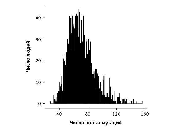 рис. 37.2. Распределение, показывающее, сколько людей имеют то или иное количество новых мутаций. По рисунку из J?nsson et al., 2017.