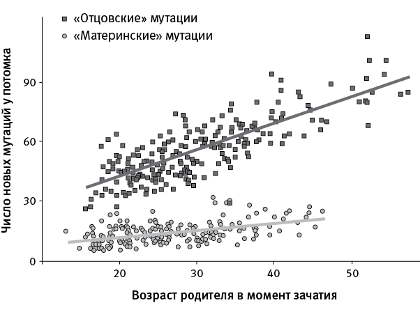 Отцовское или материнское происхождение удалось с максимальной точностью установить для 15 746 мутаций, зарегистрированных в тех тройках, где были данные по «потомкам потомков». Оказалось, что 80,4 % новых мутаций имеют отцовское происхождение, то есть люди получают их с геномом сперматозоида. Число таких мутаций быстро растет с возрастом отца (верхняя прямая на рис. 37.3). Каждый год жизни отца прибавляет в среднем по 1,47 новых мутации его потомкам. Это меньше прежних оценок. Число мутаций материнского происхождения тоже увеличивается с возрастом матери, но вчетверо медленнее (нижняя прямая на рис. 37.3) — на 0,37 за год жизни матери.