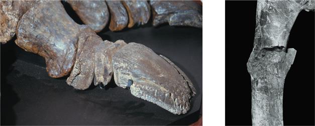 Отложим пока темпы роста и посмотрим, что еще анатомия костей динозавров может рассказать нам об их биологии. У некоторых найденных динозавров сохранились сломанные и зажившие кости, а у других на костях есть странные бугры, неровности или участки с необычной текстурой. Сломанные и зажившие кости говорят о том, что динозавры получали раны в сражениях, во время падения или других несчастных случаев. Найдены рогатые динозавры, у которых отломаны части рогов или с выбоинами на лицевых костях, тираннозавр со сломанными ребрами, поврежденной передней лапой и инфицированной костью голени, а также аллозавр, на костях голени и хвоста которого остались дыры, по-видимому, следы ран, нанесенных хвостовыми шипами стегозавров.
