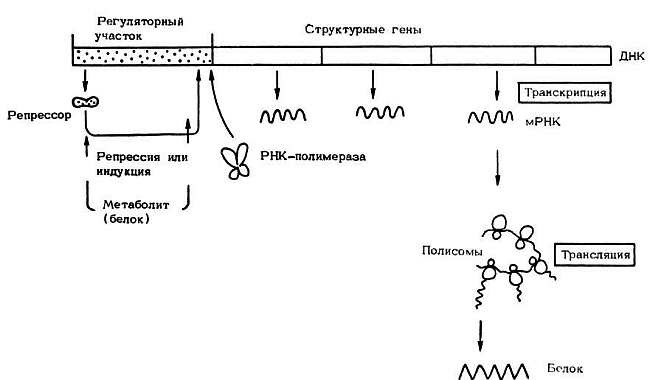 Рис. 9. Упрощенная схема регуляции биосинтеза белка. Взаимодействие специфических регуляторов (метаболисты, белки) с регуляторным участком ДНК определяет возможность для РНК-полимеразы инициировать транскрипцию, считывание генетической информации с определенных участков структурных генов. Образующаяся в результате транскрипции информационная РНК (иРНК) служит матрицей для биосинтеза белка в рибосомах