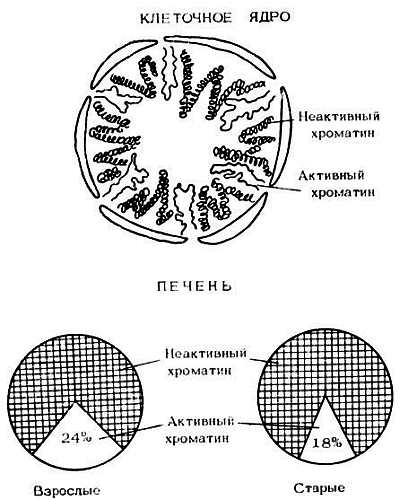 1. В ядре клетки находится сложный молекулярный комплекс — хроматин. В нем и заключена молекула ДНК с ее генетической информацией. Кроме того, в состав хроматина входят белки, рибонуклеиновые кислоты, липиды. Хроматин является тем комплексом, благодаря которому осуществляются считывание генетической информации, регуляция генетического аппарата клетки. Вот почему наступающие с возрастом изменения структуры и функции хроматина становятся одним из ведущих генорегуляторных механизмов старения. В старости увеличивается доля неактивного хроматина и уменьшается доля активного (рис. 10). Нарастает явление так называемой гетерохроматинизации, уплотнение хроматина, делающего его менее активным. Хроматин состоит из отдельных частиц — нуклеосом, число и размеры которых изменяются при старении. Уплотнение, компактизация хроматина в старости вызвана тем, что связи между ДНК и белками становятся более прочными, между ними образуются поперечные сшивки. Все это затрудняет считывание генетической информации. Очень важно то, что уплотненные участки хроматина становятся менее доступными ферментам, "ремонтирующим" ДНК, и это способствует постепенному накоплению ее повреждений.