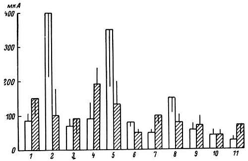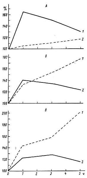 Уравнительная фаза характеризуется не только изменением величины реакции, но и изменением порога реакции, т. е. чувствительностью. Так, меньшие дозы тироксина, адреналина, вазопрессина вызывают у старых животных изменения обмена и функции сердца; снижается также максимальная величина ответа, нивелируются различия в реакциях на различные дозы этих веществ. Парадоксальная фаза характеризуется нарушением силовых отношений — слабые раздражители вызывают более выраженную реакцию, чем сильные. К примеру, у больного пожилого человека различные сердечные препараты могут вызвать в малых и средних дозах более значительную реакцию, чем при введении больших доз. В печени старых животных малые дозы гормона гидрокортизона вызывают более выраженный синтез фермента, чем большие дозы (рис. 11).