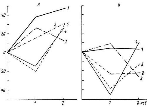 1 — масса левого желудочка; 2 — содержание нерастворимых белков; 3 — растворимых белков; 4 — сердечный выброс; 5 — содержание креатинфосфатазы