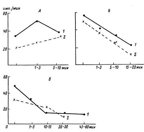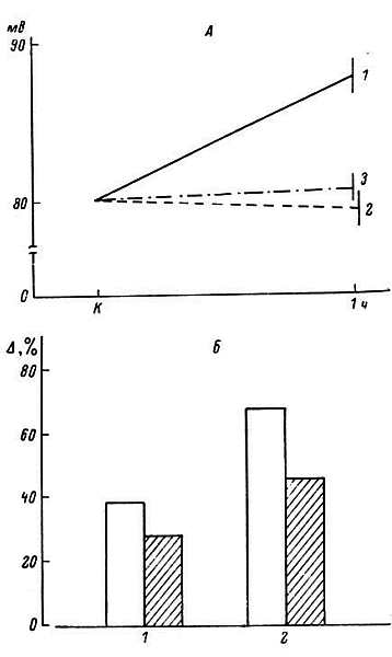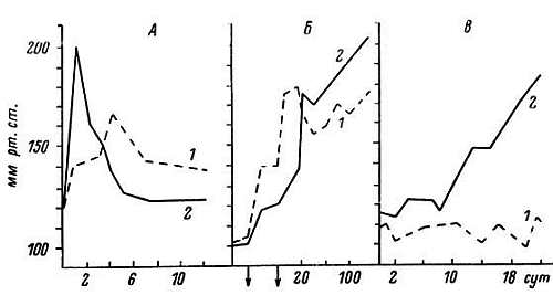 А — почечная; Б — рефлексогенная; В — вазопрессиновая. 1 — взрослые кролики; 2 — старые