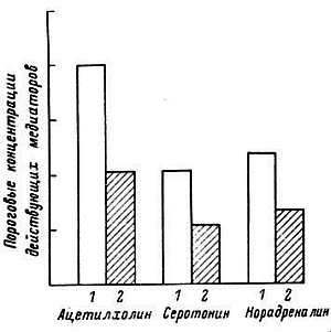 В старости падает в крови концентрация нейропептида — субстанции Р. Он обладает выраженным сосудорасширяющим свойством. Рост вазопрессина, снижение концентрации субстанции Р способствуют возникновению гипертонии (рис. 32). Большое значение в снятии боли при самых различных состояниях имеет система нейропептидов — эндорфины — энкефалины. Повышение их концентрации приводит к ослаблению боли, действует как антистрессовый фактор. По данным Г. В. Валуевой, М. В. Фролькис, в крови старых животных резко нарастает содержание энкефалинов и падает — эндорфинов. Это приводит к изменению болевых ощущений, в частности и при инфаркте миокарда.