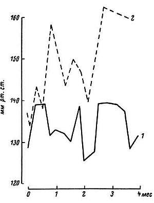 На рис. 30 представлены данные об изменении артериального давления у молодых и старых кроликов при различных моделях артериальной гипертонии: рефлексогенной, вазопрессиновой и почечной. В том случае, когда первичные сдвиги связаны с нарушением рефлекторных механизмов, рост артериального давления более выражен у взрослых животных, при действии гуморальных — у старых. Следует обратить внимание на то, что в поздние сроки рефлексогенной гипертонии артериальное давление у старых кроликов становится более высоким, чем у взрослых. Именно в эти сроки в патологический процесс вовлекается почечный фактор, нарастает содержание ангиотензина в крови, чувствительность к которому у сердца и сосудов в старости высока.