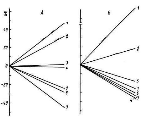 Раньше других возникает так называемая "уравнительная" фаза. Она характеризуется тем, что при действии раздражителей разной силы их эффекты выравниваются, т. е. уравнивается величина реакции на слабое и сильное раздражение. При трех типах физической нагрузки, названных нами слабой, средней и сильной, у пожилых людей различия в реакциях меньше, чем у молодых, — эффекты как бы выравниваются (рис. 28). Другой пример. Инсулин вызывает падение уровня сахара крови. Различия в изменении уровня сахара крови при различных дозах гормона у старых кроликов менее выражены, чем у взрослых.