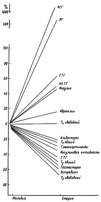 Итак, регуляторный сдвиг, имеющий приспособительное значение в молодом возрасте, например рост концентрации вазопрессина, адреналина, кортикостерона (все это возникает при стрессе), в старости в условиях изменения реактивности клеток и тканей может стать причиной нарушений, повреждений, некроза, гибели. Следовательно, любой сигнал на этапе прямой и обратной связи должен оцениваться не сам по себе, а по отношению к реактивности воспринимающих клеток. Сложность состоит в том, что отдельные органы, отдельные клетки одного и того же органа стареют не в одинаковом темпе и потому могут находиться в различных фазовых состояниях. Все это и создает значительную пестроту ответных реакций при старении.
