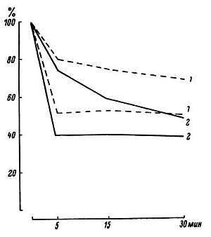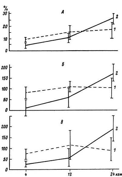 Рис. 28. Влияние дозированной физической нагрузки (работа на кистевом эргографе 4.12 и 24 кгм) у людей в возрасте 60–69 лет (1) и 20–29 лет (2).
