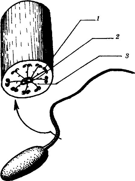 Строение жгутика: 1 — микротрубочки; 2 — «спица»; 3 — продольные тяжи.