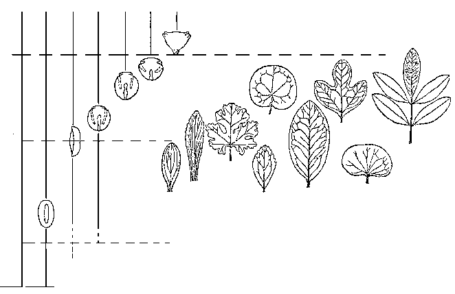 2. Появление «мясистых» листьев с большим объемом фотосинтезирующей паренхимы, вызвавшее появление листогрызущих насекомых. Дело в том, что до того насекомые потребляли лишь генеративные органы, содержимое сосудов, даже древесину — но только не листья: в листе голосеменного (даже такого, как гинкго), попросту говоря, нечего есть. Ситуация меняется лишь с появлением цветковых — объеденные листья и мины (ходы, проедаемые личинками насекомых в толще листа) известны с самого начала позднего мела (сеноманский век). На покрытосеменных сформировалась обширная фауна листогрызущих насекомых, и уже после этого они перешли на голосеменные, папоротники и хвощи.