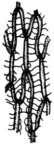 Заштрихованы живые хлорофиллоносные клетки, незаштрихованы пустотелые, мертвые, водоносные (в сухом состоянии заполненные воздухом). На рисунке изображены две водоносные клетки, каждая из них окружена шестью хлорофиллоносными. Линии, идущие поперек водоносной клетки — волокна, утолщения стенки клетки, препятствующие ее спадению; замкнутые овалы — поры, отверстия в стенке клетки, посредством которых полость клетки сообщается с наружным пространством.