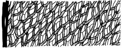Листья современных представителей без жилки ископаемых — с жилкой. Веточные и стеблевые листья у большинства видов различны по форме. Клеточная сеть и тех и других устроена одинаково. Однослойная пластинка листа образована клетками двух родов: 1) крупными, мертвыми, лишенными содержимого, бесцветными и 2) мелкими, живыми, содержащими хлоропласты. Части клеточную сеть сфагнов сравнивают с рыболовной сетью. Если представить сеть с шестисторонне-ромбоидальными ячеями, то ячея (дырка) будет изображать мертвую, лишенную содержимого клетку (в сухом состоянии она заполнена воздухом, во влажном — водой), а нить, из которой сплетена сеть, — живые, фотосинтезирующие клетки. Соответственно числу сторон каждая воздухоносная клетка окружена шестью живыми (рис. 18). Стенки этих воздухоносных клеток снабжены спиральными утолщениями, создающими жесткий каркас, препятствующий спадению стенок при отсутствии в клоках воды. В стенках клеток (и живых и мертвых) множество пор, посредством которых полости сообщаются между собой и с окружающим их пространством. В целом тело сфагна представляет сложнейшую систему связанных друг с другом и с внешним пространством полостей, общий объем которых во много раз превосходит суммарный объем живых клеток. Это и создает ту совершенно фантастическую гигроскопичность сфагнов, о которой речь шла выше (см. гл. IX). Спорогон состоит из коробочки и стопы. Он помещается на верхушке особого — безлистного — выроста гаметофита (ложная ножка, или псевдоподий), имитирующего обычную ножку бриевых мхов. (О том, как вскрывается коробочка, рассказано в гл. II.)