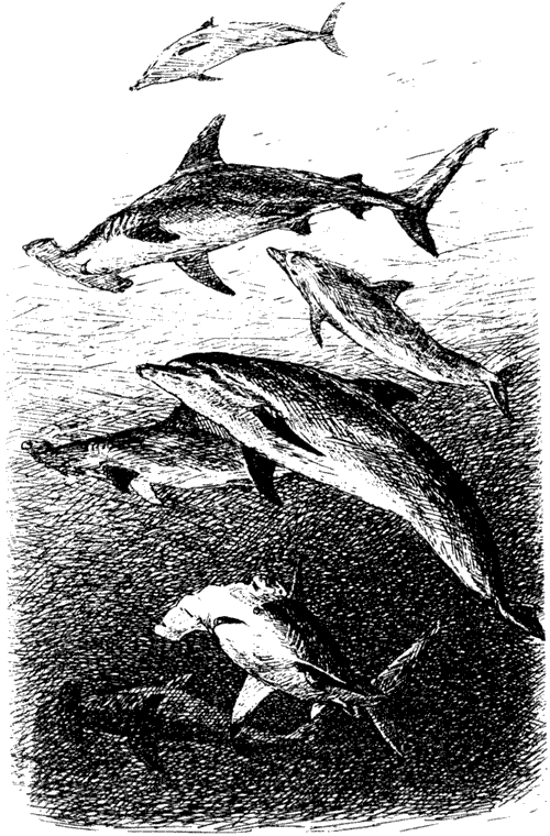 Рано утром поблизости от «Калипсо» появилась большая стая дельфинов, и среди них кружило много молотоголовых акул.