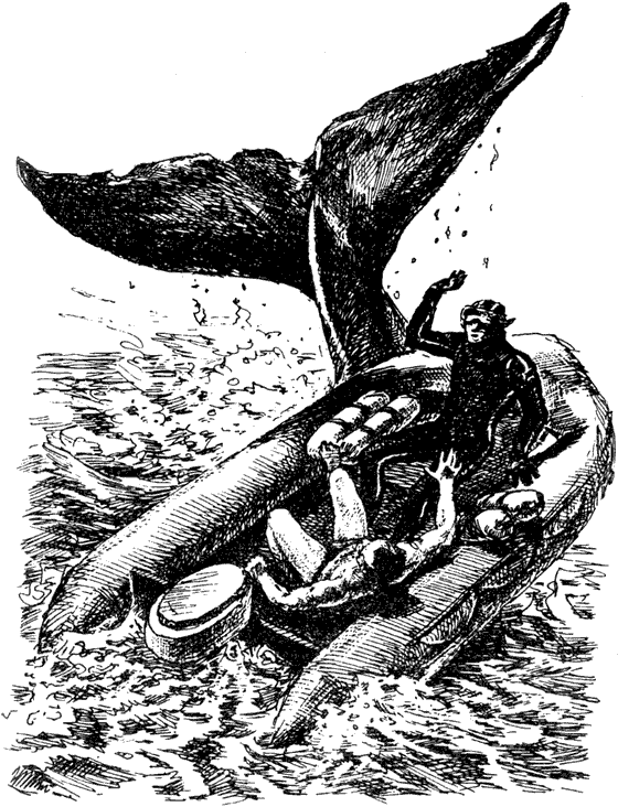 Боясь что-нибудь упустить, Делуар прыгает со своей камерой в воду. Небывалый случай — впервые человек наблюдает и снимает финвала под водой. Ай да Мишель! Впрочем, Бонничи не отстает от него — ухватился за спинной плавник кита, и зверь его тянет, словно какой-нибудь чудовищный паровоз. Тоже случай небывалый! Барский присоединяется к друзьям и снимает акробатические трюки Бонничи.