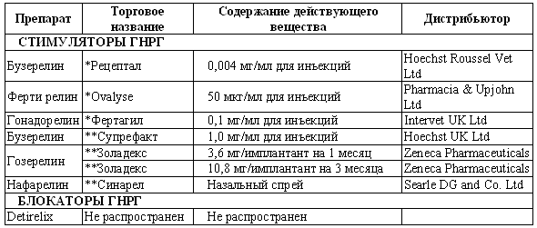 Стимуляция овуляции: однократное внутривенное введение ГнРГ (0,01 мкг/кг) на стадии эструса может ускорять овуляцию. Однако назначение человеческого ХГ более эффективно. Данное применение этих препаратов недостаточно изучено.