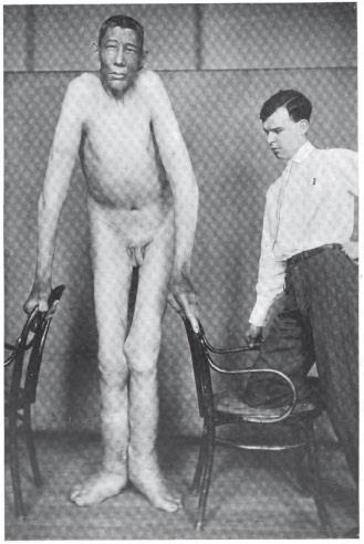 Денди в костюмах-тройках внезапно появлялись со сморщенными гениталиями и такими жирными животами, что они казались беременными; у элегантных молодых дам внезапно обнаруживались усы и горбы. Вероятно, самое грустное зрелище являл великан Джон Тернер, опирающийся на два стула, с багровым от напряжения лицом и вывернутыми ногами, готовыми подогнуться под ним. (Ассистента Кушинга с ростом 173 сантиметра, стоявшего рядом с Тернером на этой фотографии, часто останавливали на медицинских конференциях десятки лет спустя, потому что люди узнавали его по фотографии.)