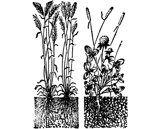 Таким образом, на севере клевер с тимофеевкой, а на юге люцерна с житняком восстанавливают структурность почв, тем самым содействуя лучшему питанию растений, их урожайности.