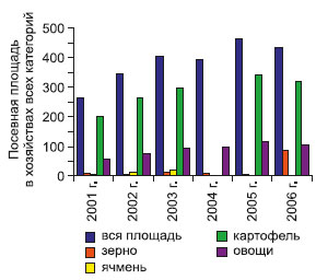 Животноводческая специализация сельского хозяйства в аймаке – это не столько дань ментальности казахов и монголов – скотоводов, сколько результат природообусловленности, здесь преобладают горные территории с сухими степными среднегорными ландшафтами. Основная территория аймака занята пастбищными угодьями, площадь посевных площадей несоизмеримо мала, в 2006 г. составляла 435,3 га, занята преимущественно под выращивание картофеля – 73,8 % пашни и кормовых культур – 24,1 %, а оставшаяся часть пашни – 2,1 % (8,9 га) занята под овощные культуры (рис. 11.9).
