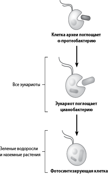 Рис. 27. Схема, отображающая два основных эндосимбиотических события, которые привели к созданию эукариотических клеток. Во время первого события клетка-хозяин (одна из архей) поглотила пурпурную несерную бактерию, которая, возможно, была фотосинтезирующей (значительно позже эта бактерия эволюционирует в митохондрию). Второе событие состояло в том, что клетка, содержащая протомитохондрию, поглотила также цианобактерию (из этих цианобактерий впоследствии разовьются хлоропласты). Два этих первичных симбиотических события являются основой эволюции микроскопических организмов, таких как зеленые водоросли (см. рис. 9), доминировавших в океанах задолго до начала эволюции животных и растений