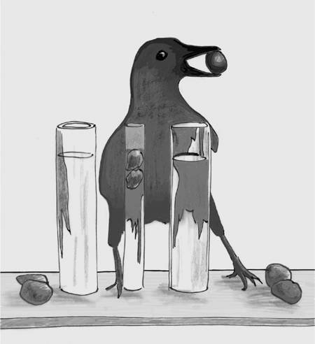 Древнегреческий поэт Эзоп, возможно, предугадал эти способности в своей басне «Ворона и кувшин». Ворона, умирающая от жажды, рассказывает Эзоп, нашла кувшин. На дне кувшина было немного воды, и ворона попыталась дотянуться до нее клювом, но уровень воды оказался слишком низок. Тогда ворона придумала хитрость, продолжает баснописец, она подобрала камешки и начала бросать их в кувшин. Потребовалось множество камешков, чтобы уровень воды в кувшине поднялся и ворона наконец смогла напиться. Какой бы неправдоподобной ни выглядела эта история, ее удалось повторить в лаборатории. Первым поставили опыт с грачами — представителями врановых, которые в естественных условиях не используют никаких орудий. Грачам предложили вертикальную трубу, наполненную водой, на поверхности которой плавали мучные черви. Дотянуться до них было невозможно, поэтому, если грачи хотели попробовать этот деликатес, им необходимо было поднять уровень воды. Такой же эксперимент провели с воронами из Новой Каледонии — известными специалистами по применению орудий. В соответствии с поговоркой «Нужда — мать изобретения» и в подтверждение басни Эзопа, сочиненной два с половиной тысячелетия назад, оба вида врановых успешно справились с заданием, используя камни, чтобы поднять уровень воды{119}.