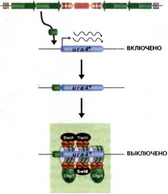 Вставка фрагментов (1—2 т.о.) рядом с экспрессируемым геном ura4+ в локусе, который в норме не склонен к сайленсингу, приводит к метилированию НЗК9, связыванию Swi6 и Chp1 и транскрипционному сайленсингу