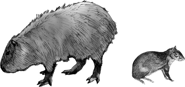 Рис. 3.1. Капибара (Hydrochoerus hydrochoerus) – самый крупный в мире грызун (слева) и агути (Dasyprocta primnolopha) – четвертый по величине грызун (справа)
