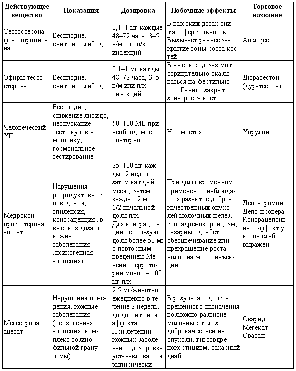 Табл. 17.4. Показания и дозировка препаратов для лечения репродуктивных проблем у котов