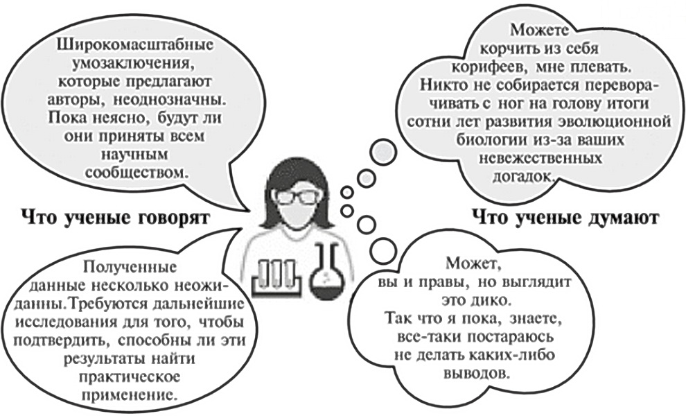 Рис. 14.6. В публичных выступлениях ученые часто вежливы (высказывания слева), но иногда их слова — лишь плохо замаскированное неприятие (мысли справа)...