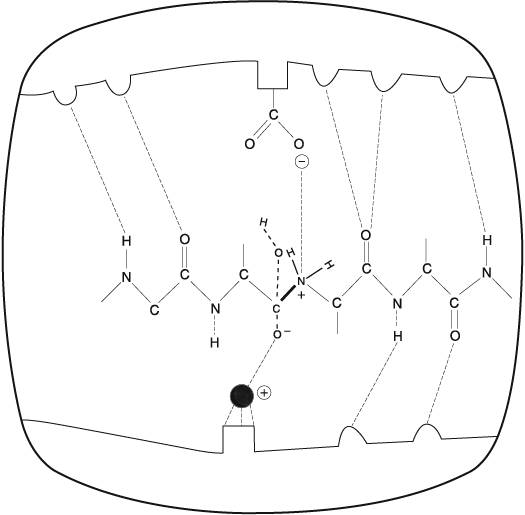 Сравнив данное изображение с рис. 3.3, вы заметите, что фермент продлевает переходное состояние пептидной связи, которого она должна достичь для полного разрушения. Между субстратами образуются слабые химические связи, обозначенные на рисунке пунктирными линиями. Эти связи представляют собой отдельные электроны, которые субстраты делят с ферментами. Благодаря этим связям субстраты приобретают определенную конфигурацию, в которой молекуле фермента, вернее, ее молекулярным «челюстям», удобнее всего разорвать пептидную связь.