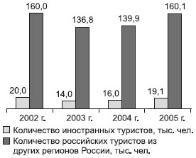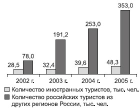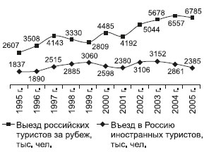 Но если въездной туризм характеризуется относительно небольшим стабильным ростом (примерно в 1,3 раза по числу въезжающих иностранных туристов), то выездной поток увеличился в 2,5–3 раза [Туризм в цифрах…, 2004].