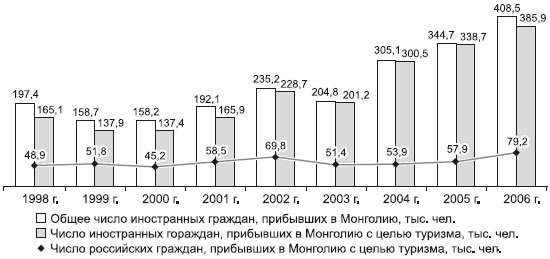Согласно официальным статистическим данным, представленным в «Монгольском статистическом ежегоднике» и отчетах Министерства дорог, транспорта и туризма Монголии, уже к 2001 г. страна принимала ежегодно более 150 тыс. туристов. 2003-й год был объявлен в Монголии «Годом посещения страны туристами», а в течение 2004 г. Монголию посетили 300 тыс. иностранцев, среди них лидируют китайцы. В 2006 г. число китайских туристов составило здесь почти 180 тыс. чел. Второе место стабильно занимает Россия. С 1998 по 2006 г. число поездок российских туристов в Монголию увеличилось от 49 до 79 тыс. Почти 40 тыс. туристов прибыли из Южной Кореи, 16 тыс. – из Японии, 11 тыс. – из США, 8,5 тыс. – из Германии. В 2006 г. Монголия приняла почти 386 тыс. иностранных туристов, в том числе 79 тыс. российских граждан (рис. 12.26) [The Yearbook of Mongolian Tourism Statistics, 2005; Mongolian Statistical Yearbook, 2007; Даваадоржийн Балжинням, 2005].