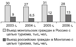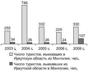 Туристические потоки между Республикой Бурятия и Монголией значительно превосходят Иркутскую область по числу прибытий и выездов. Количество туристов из Бурятии, направляющихся через монгольскую границу, составляет около 10 тыс. чел. в год (в 2006 г. – 10,5 тыс. чел.) (данные Генерального консульства Монголии в г. Улан-Удэ; фондовые материалы Байкальского института природопользования, г. Улан-Удэ). Увеличение туристического потока Монголия-Бурятия происходит за счет групп туристов, выезжающих с культурно-познавательной целью. К 2006 г. эта категория составила 13,5 %. Кроме того, 6,1 % монгольских туристов приезжают в Бурятию с целью досуга и отдыха, 1,26 % – посещают друзей и родственников, менее 1 % приезжают с целью лечения [Сведения о приеме и обслуживании…, 2006].