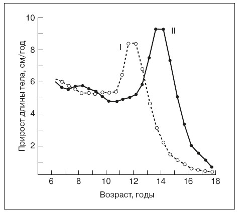 Рис. 46. Пубертатный скачок роста длины тела у девочек (I) и мальчиков (II)