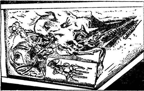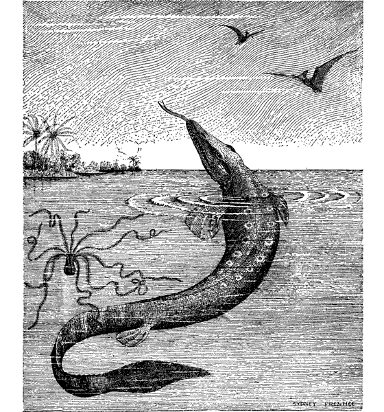 Я думаю, ни один художник не представлял себе так ярко этих огромных пресмыкающихся, как м-р Сидней Прентайс, который работал в музее Карнеджи. Здесь воспроизводится реставрация, сделанная им для иллюстрации труда д-ра Виллистона о канзасских мозазаврах (рис. 9). Я очень обязан ему за эти рисунки. Он, несомненно, вдохнул снова жизнь в обитателя древнего Мелового океана. Я не представляю себе, чтобы кто-нибудь после тщательного изучения скелета мог найти в этой реставрации малейшую ошибку с научной точки зрения.