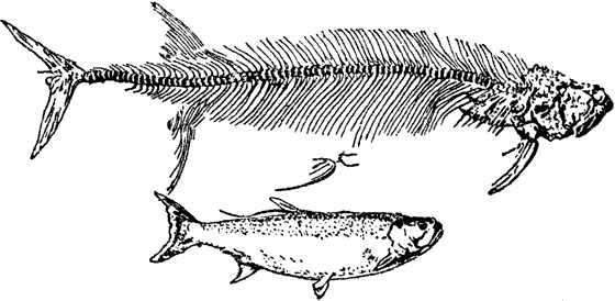 Рис. 10. Огромная рыба мелового периода Portheus molossus (сверху), по сравнению с нынешней двухметровой треской.